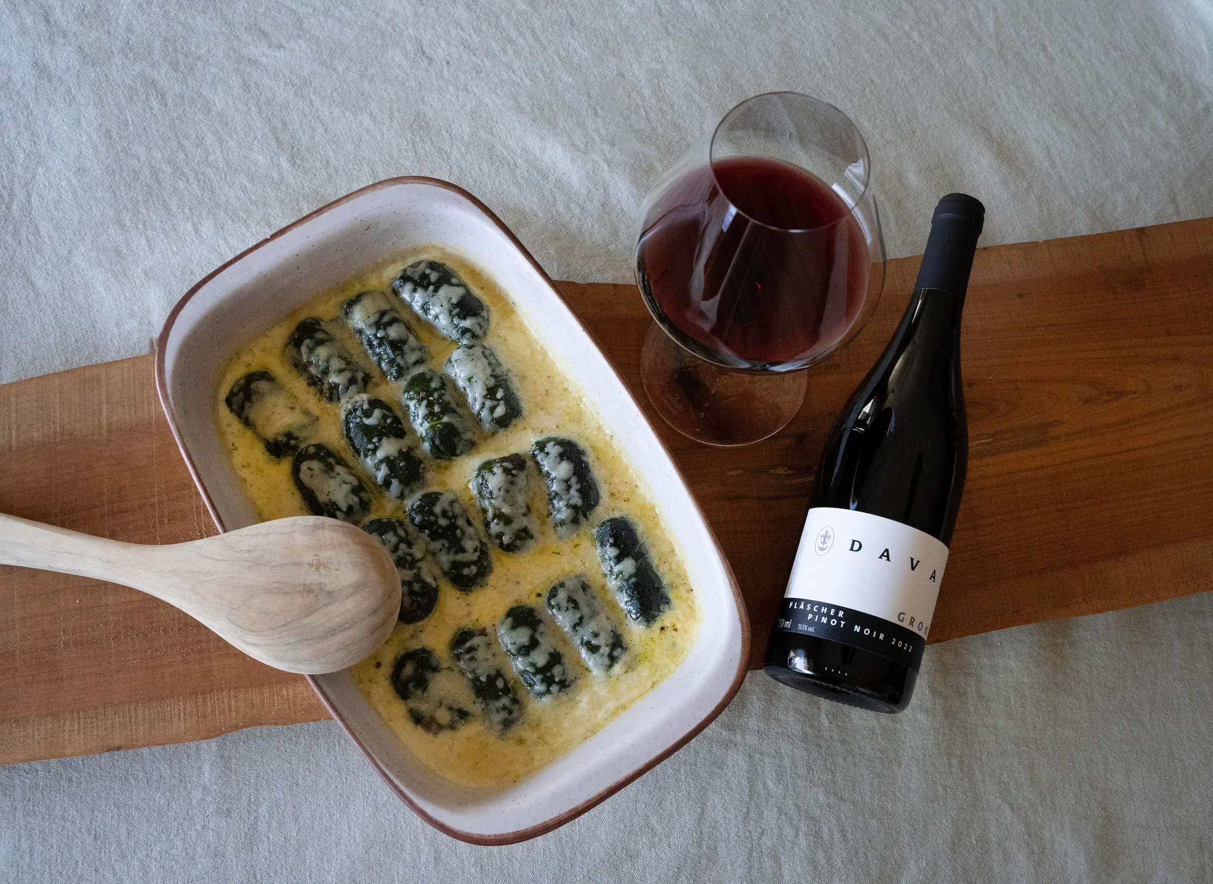 – Gefrorene Capuns in eine Auflaufform legen, 250 ml Halbrahm und etwas Gemüsebouillon beigeben.