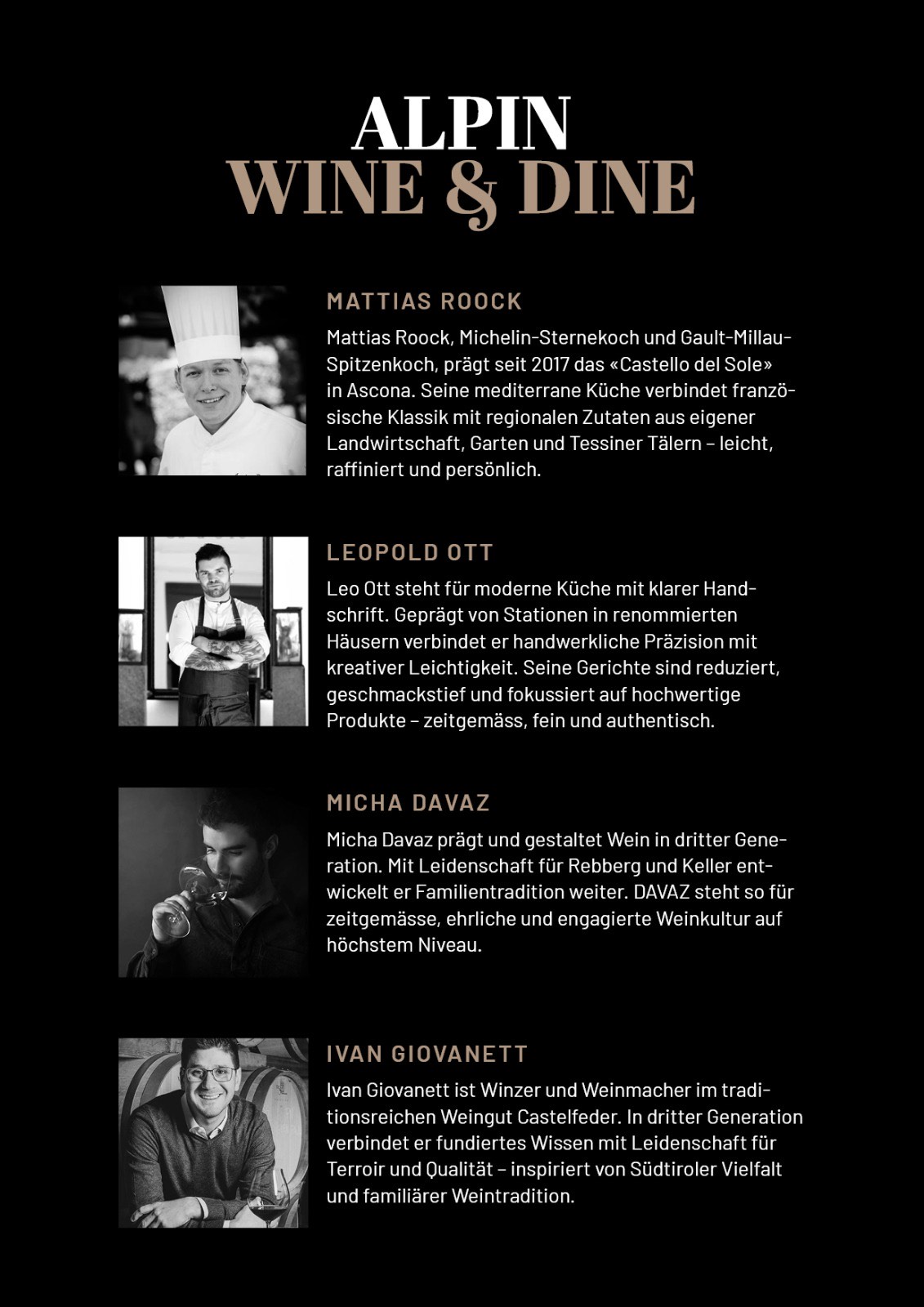 Ein Abend, der Alpine Weinkultur mit moderner Spitzenküche vereint: Die Sternenköche Mattias Roock und Leopold Ott zaubern in der von Salis Vinothek ein hochkarätiges Fine-Dining-Menü, während wir zusammen mit Ivan Giovanett des südtirolischen Weinguts Castelfeder sorgfältig kuratierte Weine servieren. Geniessen Sie mit uns einen besonderen Genussabend in exklusivem Rahmen mit stark limitierten Plätzen.