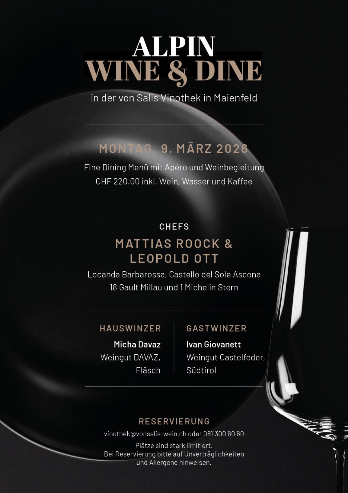 Reservation erforderlich per E-Mail an vinothek@vonsalis-wein.ch oder telefonisch unter 081 300 60 60. Bitte weisen Sie bei der Reservierung auf Unverträglichkeiten und Allergene hin.