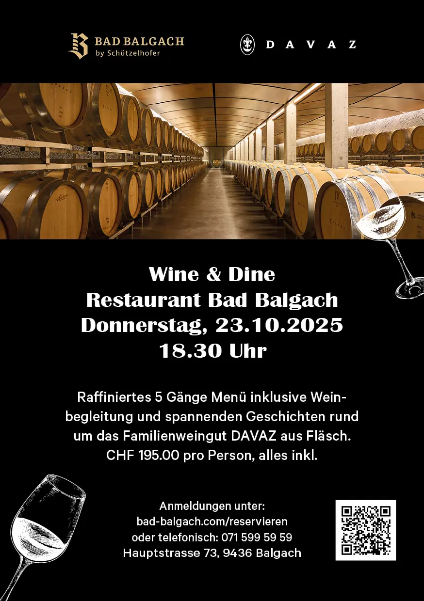 Der Weinkeller von Jackie und Bernd im Restaurant Bad Balgach hat Kultstatus und wir freuen uns riesig, dass am 23. Oktober 2025 jugendlich-frische aber auch gereiftere Weine von uns, die bestens gelagert auf einen solchen Event gewartet haben, göffnet werden. Micha begleitet das Überraschungsmenü von Bernd und gibt Anekdoten aus dem Rebberg, dem Keller und ungefilterte Geschichten aus dem Leben in einem Familienbetrieb zum Besten. Ein kulinarisches Highlight, dem wir entgegenfiebern.