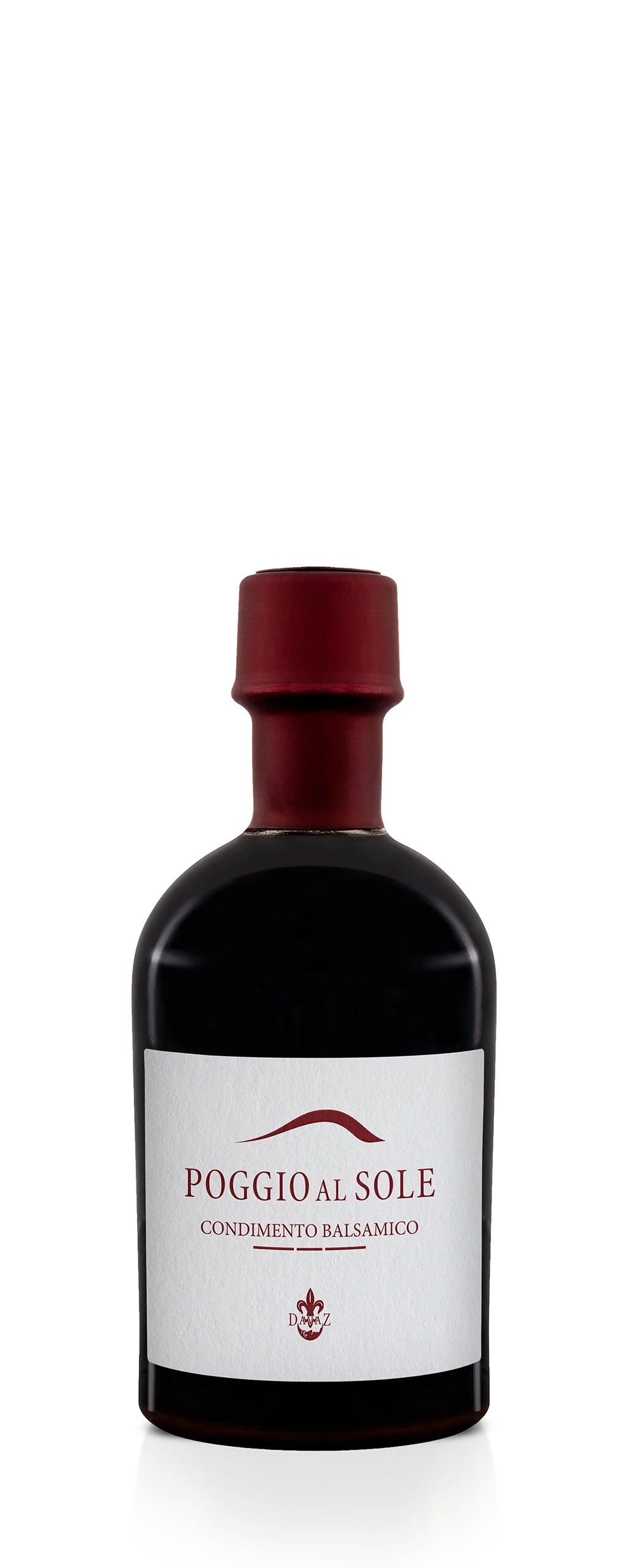 Rund und ausgewogen – der Balsamico von Poggio al Sole Die Sangiovese Trauben für diesen feinen Balsamico werden von Hand gelesen und sofort abgepresst. Der süsse, unvergorene Traubensaft wird dann in Modena in einer klassischen Acetaia weiterverarbeitet. Es präsentiert sich ein dunkelbraun glänzender Balsamico mit einem feinen, angenehm süssen Duft und Anklängen von reifer Frucht. Am Gaumen zeigt er sich harmonisch süss-sauer, mit eleganter Essignote und leichter Holzwürze. Rund und ausgewogen im Abgang – ein klassischer, hochwertiger Balsamico mit Tiefe und Charakter.